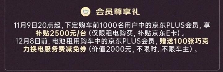此外,11月9日20点起下定的前1000名京东PLUS会员,选择电池租用方案还可获赠价值2500元的京东E卡。如此一来,在叠加了上述权益后,租电版本实际的到手价其实已经低至4.54万元,而整车购买的到手价则约8.59万元,性价比同样很高。