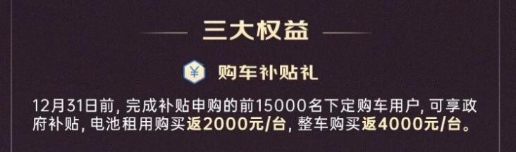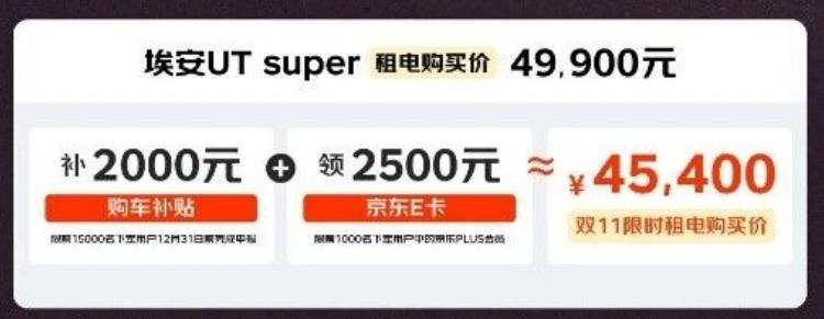 另外,京东作为埃安UT super这车的独家销售平台,还联合三方资源推出了返现权益。而其中就包括有12月31日前完成补贴申购的前15000名下定用户,可享政府补贴与品牌专项补贴,其中选择电池租用方案的用户可获2000元/台补贴,整车购买则可享受4000元/台补贴。