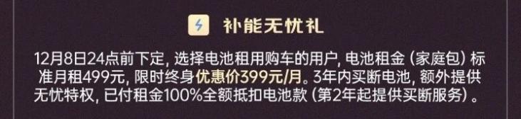 第三,12月8日24点前下定的电池租用用户,若在3年内决定买断电池,已支付租金可100%抵扣电池费用,并享有额外无忧特权。换句话说,如果一块电池的总价是3万元,那你在付了2年9600元租金后,再想买断电池的时候就只需再出2.04万元即可,这点我认为还是很实在的,也的确无愧于“国民好车”的称号。