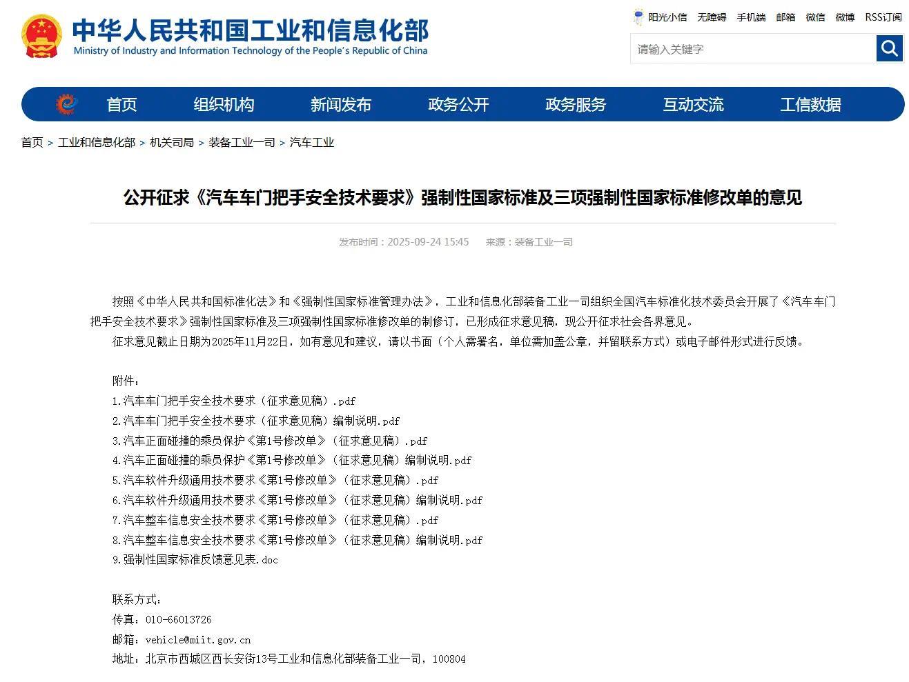 9月24日,工业和信息化部装备工业一司组织全国汽车标准化技术委员会,发布了《汽车车门把手安全技术要求》强制性国家标准征求意见稿,明确向全隐藏式门把手设计亮起了“红牌”