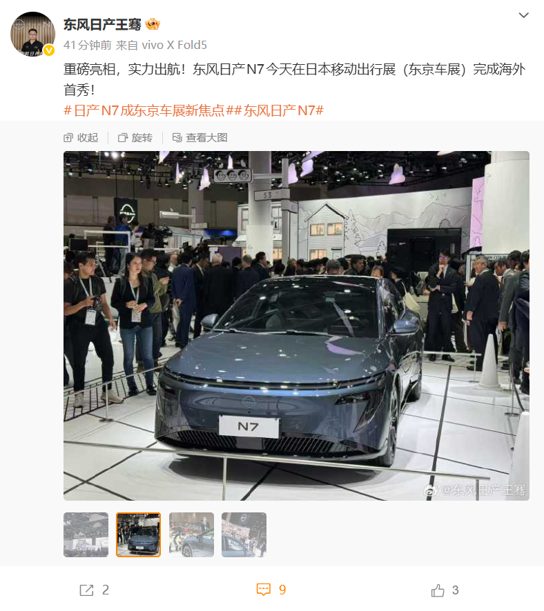 东风日产销售公司新能源品牌总经理王骞今日发文称,东风日产N7今天在日本移动出行展(东京车展)完成海外首秀。