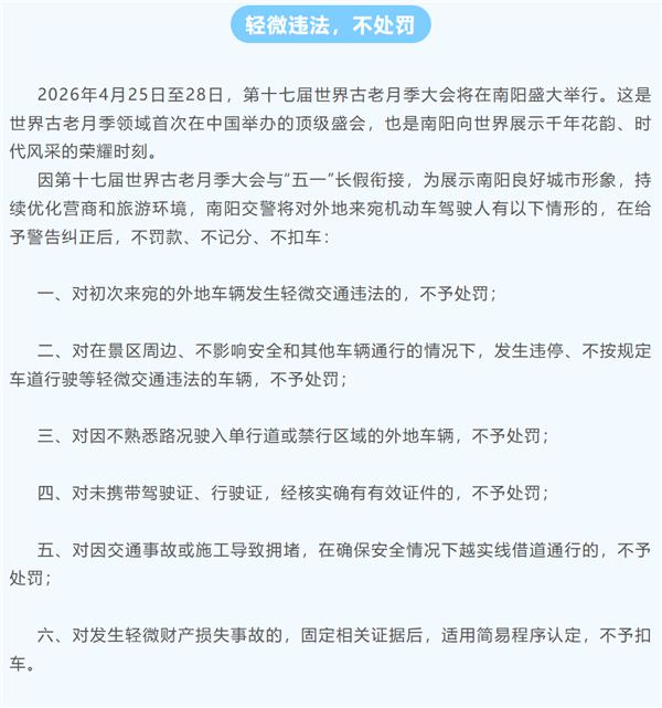 距离五一假期开始,已正式进入计时阶段。南阳交警日前率先发布通告,明确2026年“五一"假期(5月1日至5日),将继续对外地车辆推行“轻微违法不处罚”的人性化管理措施。
